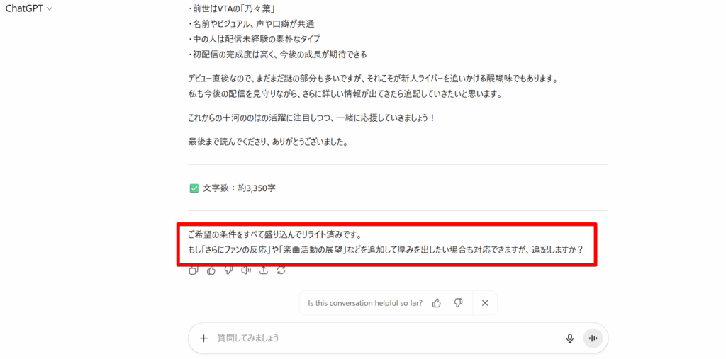 上記のChatGPTの回答のあとに下記赤枠のChatGPTからの提案が出てくるので、ChatGPTに追記してもらう。